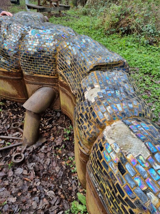 You may have noticed that the Tommy Pudding newt has suffered some damage. Several tiles are missing and without attention the damaged patches will only get worse. Ben Greenwood, the artist of the sculpture, has generously provided a pack of replacement tiles. When the weather improves and temperatures rise, we will make a repair to bring Tommy’s mosaic skin back to its former glory.